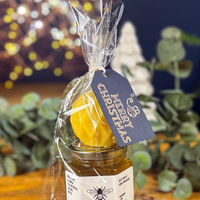 Our Christmas gift set includes a jar of our Summer 2025 raw and unpasteurised Salford Honey and a festive themed candle.